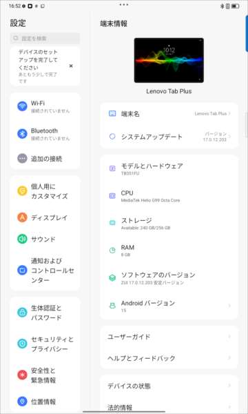 「Lenovo Tab Plus」の初期画面です。