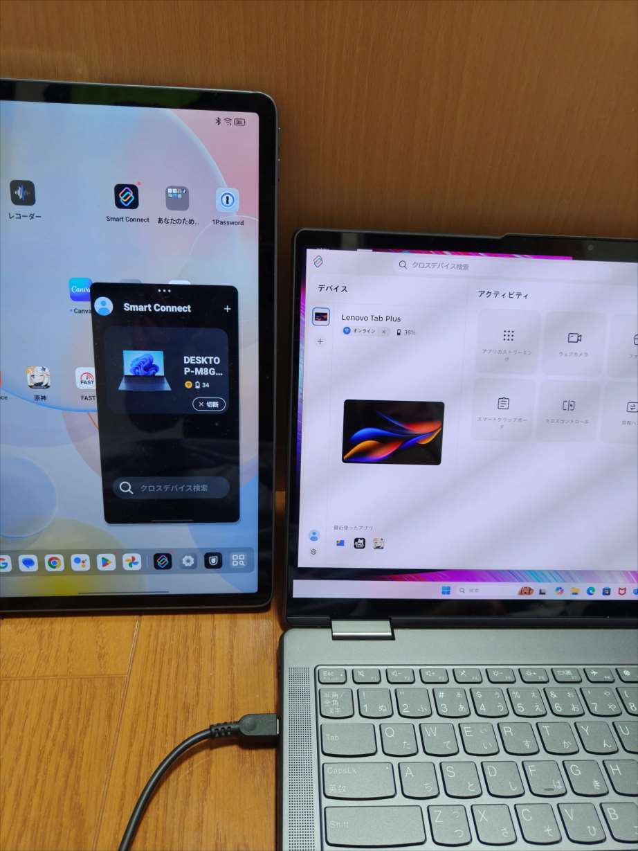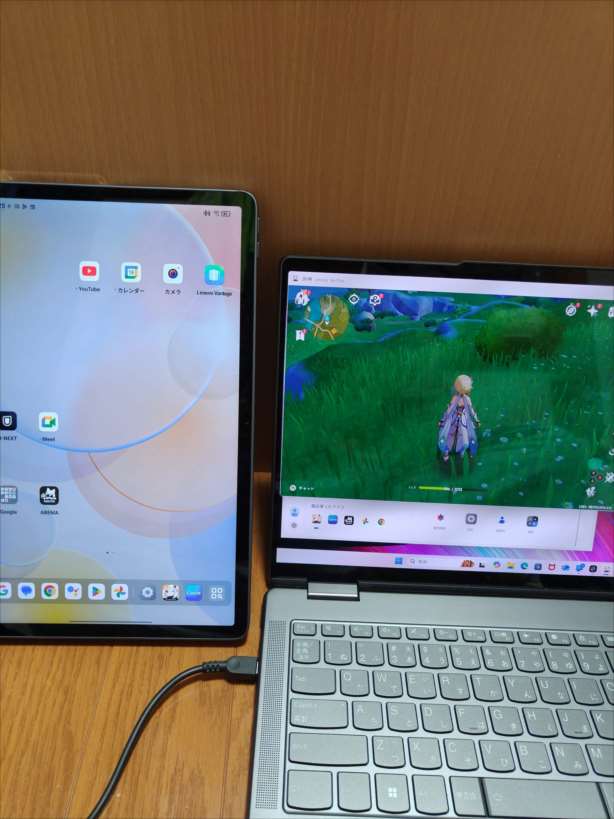 「Lenovo Tab Plus」に入っているゲーム「原神」をパソコン側で表示しました。操作はパソコンでできますが音声は「Lenovo Tab Plus」から流れています。パソコン側でコントローラーを接続しても動かなかったです。「Lenovo Tab Plus」とコントローラーをBluetooth接続するとコントローラーを使って操作が出来ました。