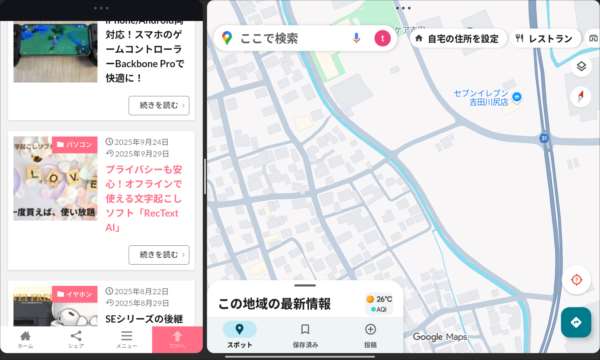 当サイトとグーグルマップを並べました。画面は真ん中の仕切りを動かすとサイズ変更できます。