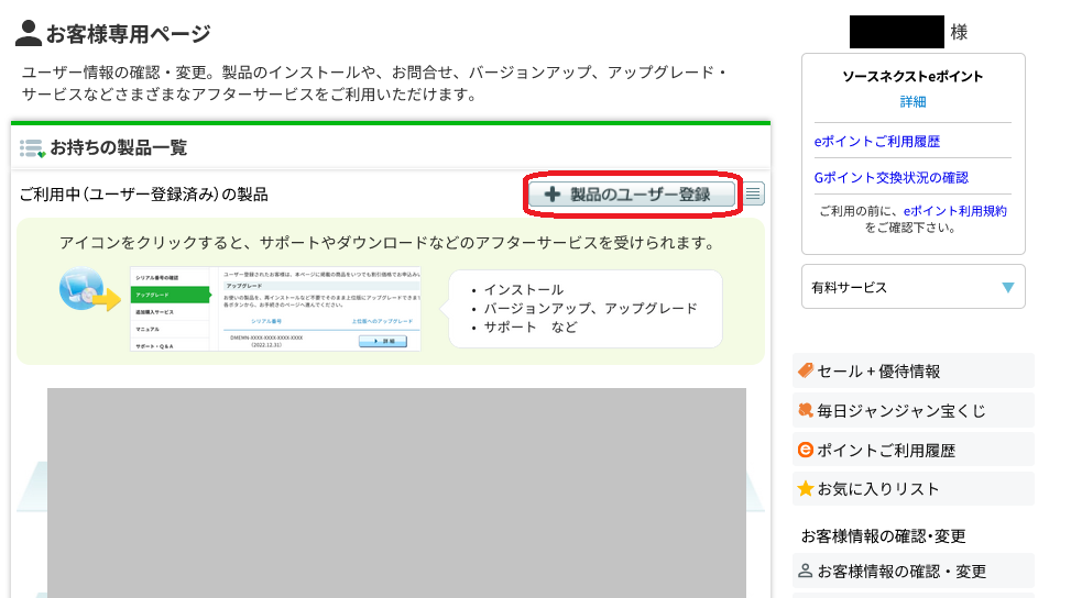 ソースネクストのページにログインしてお客様専用ページに入ります。その中に製品のユーザー登録があるのでこちらをクリックします。