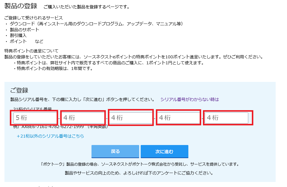 購入した時に送られてくる21桁のシリアルコードをこちらに入力します。下にあるアンケートに回答すると100ソースネクストeポイントがもらえます。ソースネクストでのお買い物100円分になるのでアンケートの回答をおすすめします。