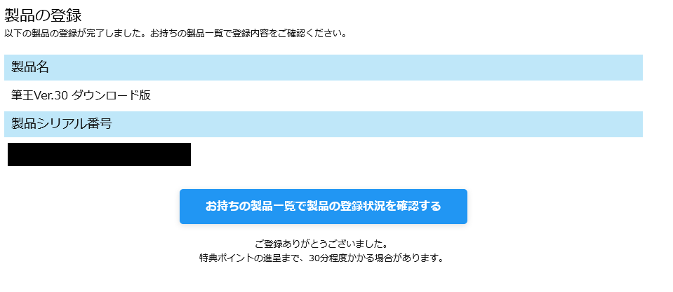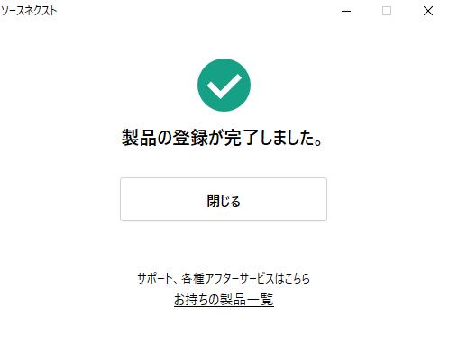 製品の登録が完了しましたと表示されたので閉じるとクリックします。