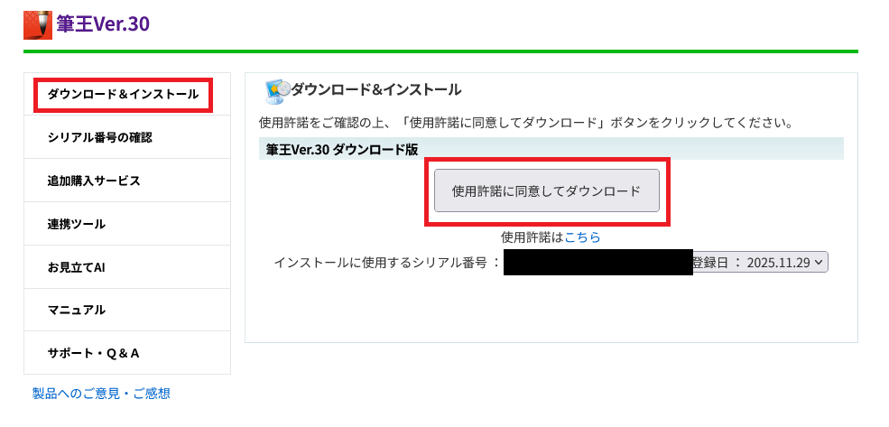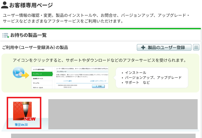 先ほどのお客様専用ページに戻ると筆王Ver.30が追加されています。インストールするにはこちらをクリックします。