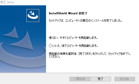 インストールが完了した画面です。再起動を促すメッセージが出ます。こちらはすぐ再起動するかあとで自分で再起動するか選べるので閉じたら困る画面を開いているならいいえを選ぶといいです。
