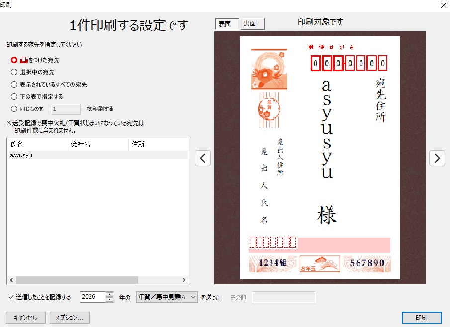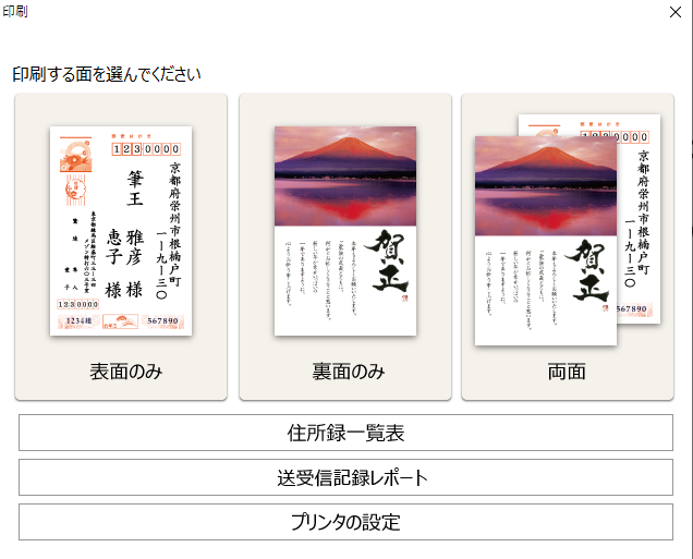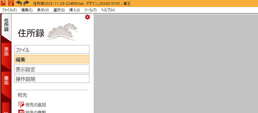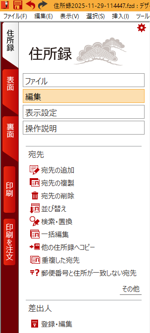 また操作は左側にメニューがあって分かりやすいです。「住所録」「表面」「裏面」「印刷」「印刷を注文」とあります。