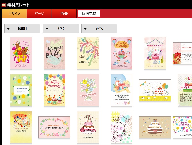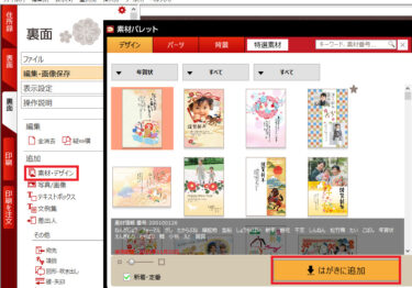 デザインは初心者でも簡単にできるようになっています。左のタブの裏面をクリックして「素材・デザイン」を選択すると素材パレットが開いてサンプリがたくさん表示されます。