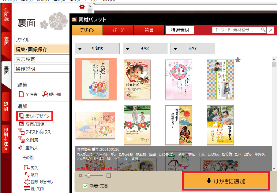 | 製品の特徴 | ・毎年伝統的なスペシャルデザインを収録 ・「流麗行書体」フォントで宛名がきれい。 ・最多の素材45万点 |