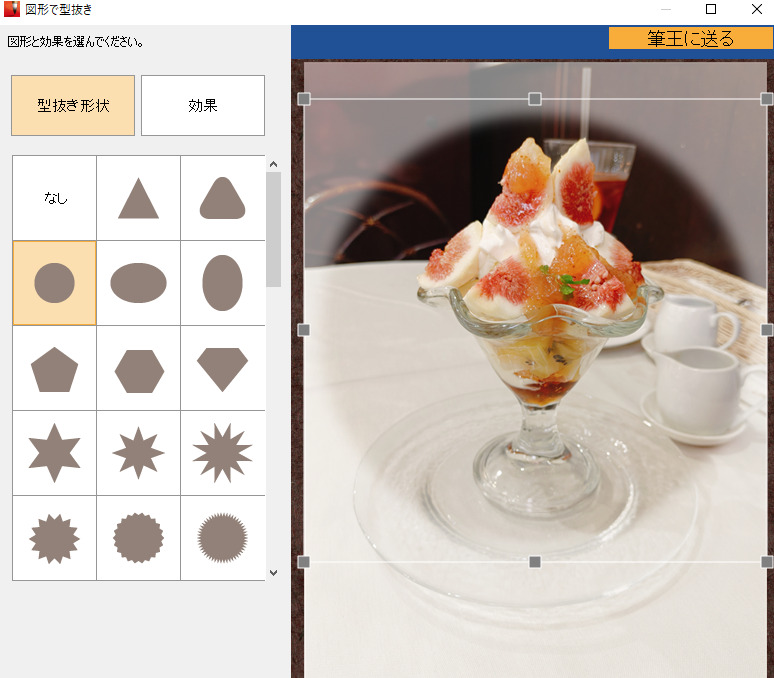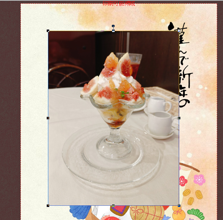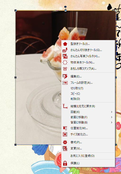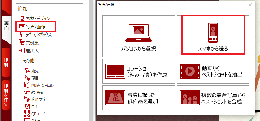 写真を選んで送るをタップするとパソコンの筆王の裏面に送信した画像が現れます。サイズを変更しなくても良くめちゃくちゃ簡単でした。