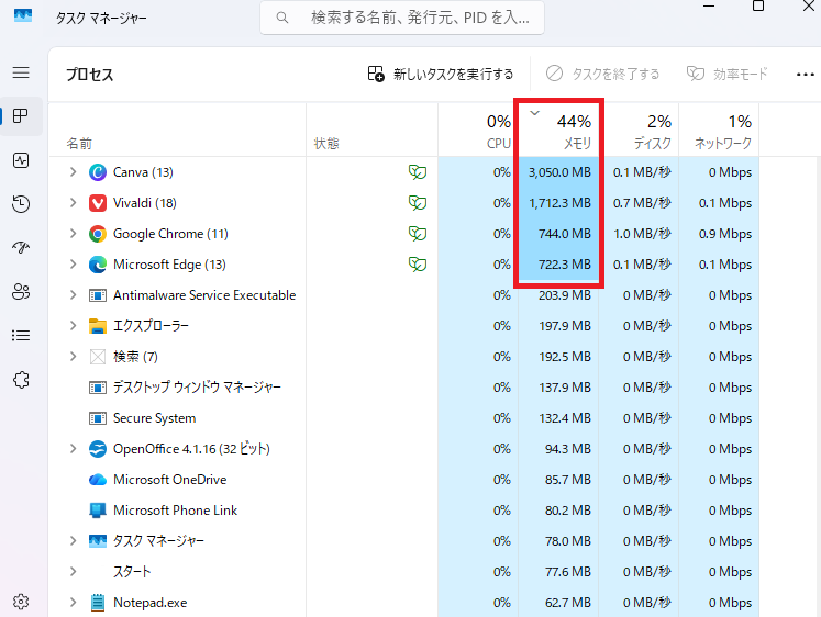 メモリが32GBあるのでCanvaを開いて複数のブラウザでABEBAを再生しました。Vvaldi、chrome、edgeです。メモリは44%とまだまだ余裕があります。8GBだと一つブラウザを開くと80%超えるのでメモリは大量にあった方がいいですね。使用中、フリーズすることなく快適です。