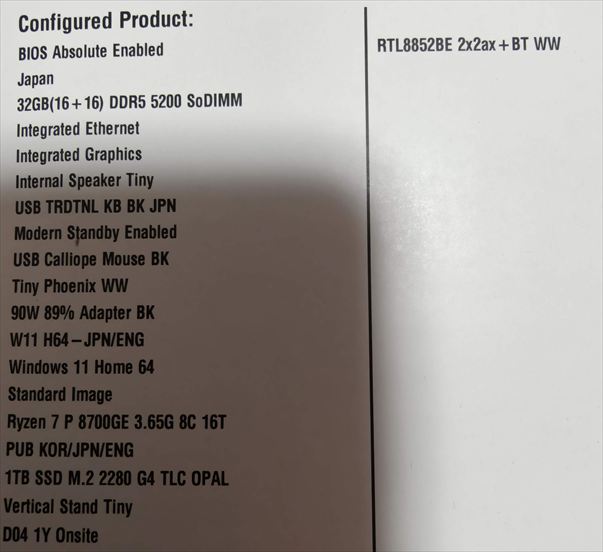 お借りしてた「ThinkCentre M75q Tiny Gen 5」のスペック