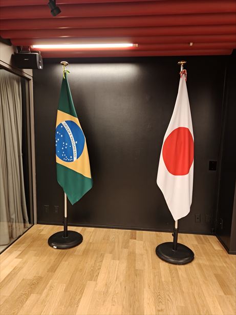 地下に降りたところにブラジルと日本の国旗が並んでいます。国旗が並んでいるのを見ると大使館に来たと実感しますね。